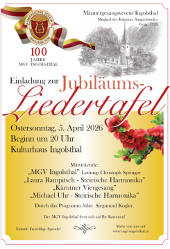 Am 5.4. laden wir sie alle zur Jubiläums Liedertafel "100 Jahre MGV Ingoslthal" ein