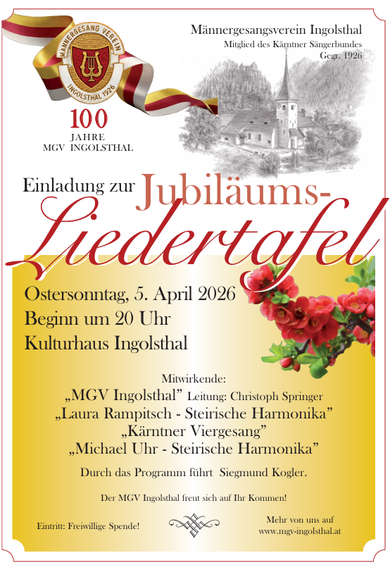 Jubiläums Liedertafel "100 Jahre MGV Ingolsthal" am Ostersonntag 5.04.2026 20 Uhr